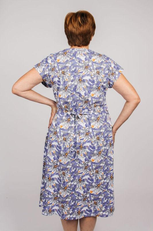 Women's robe , A-line silhouette. product length above the knee central zip closure, V-neck treated with edging on the shelf patch shaped pockets one-piece back, without seams set-in sleeve, short.At the back, to form a fitted silhouette, there are two half-belts that are tied in the lower back with a neat bow. The model is designed for a height of 170-176cm.