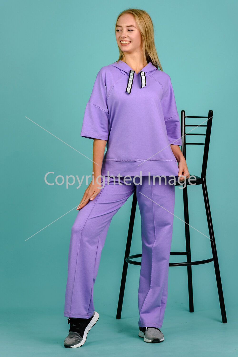 The suit consists of a hoodie and trousers. Sweatshirt is straight, loose, hooded, with short sleeves. On the shelf there are symmetrical shaped coquettes. Incisions were made in the lower part of the side seams. The bottom of the shelf and back are completed with a belt. Trousers are loose, straight, with arrows, with pockets, at the waist.