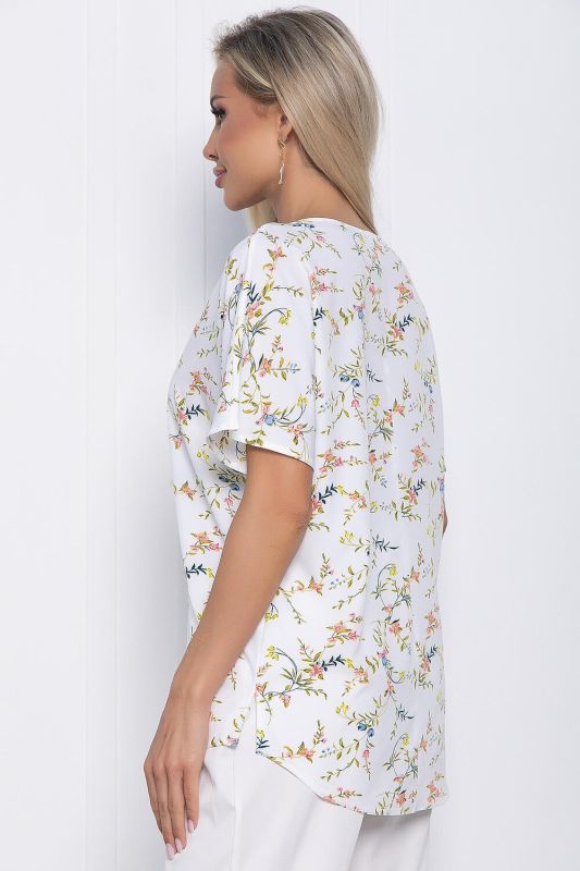 A floral print blouse will be a great addition to your wardrobe! It is easy to combine it with trousers, jeans or a skirt. It can also be worn under a jacket or jacket. A loose - fitting model with a one-piece sleeve and rounded neckline. It is suitable for everyday looks and for home use. Thanks to its loose fit, it will provide comfort and freedom of movement. There are slits on the sides. The front part is shorter than the back.